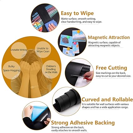Tool-Free Installation magnetic chalkboard film features a strong adhesive backing, making installation a breeze. Simply peel off the backing and stick the film directly onto any smooth wall. It’s space-saving, requires no tools, no drilling, and won’t damage your walls.