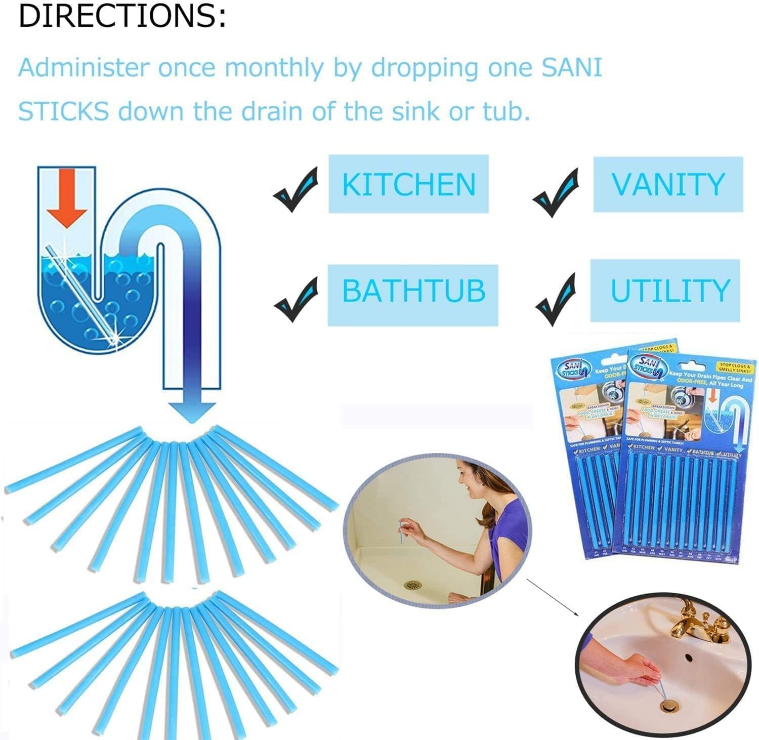 Sani Sticks will be located in the drain pipe itself, they are invisible and safe for health and plumbing.